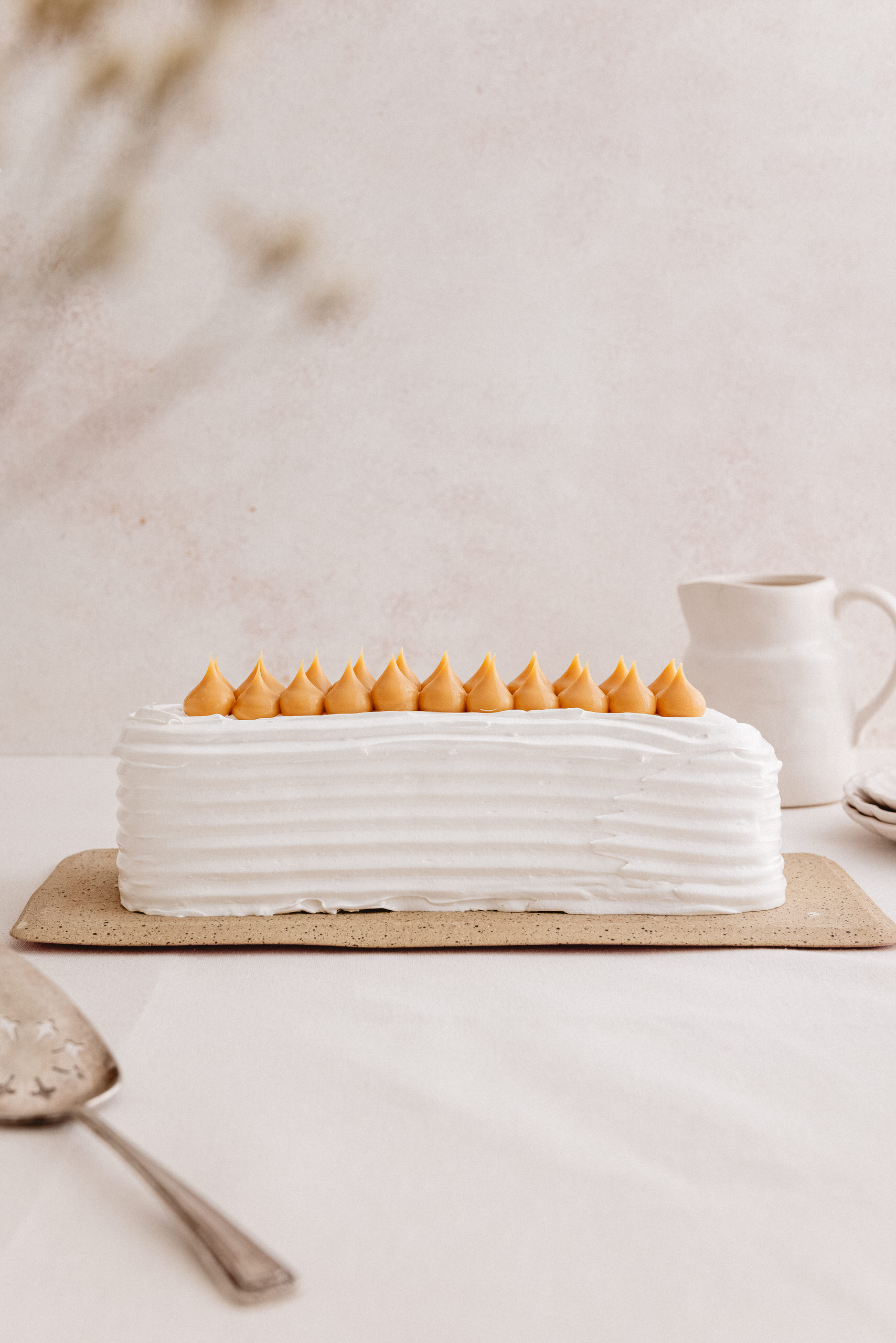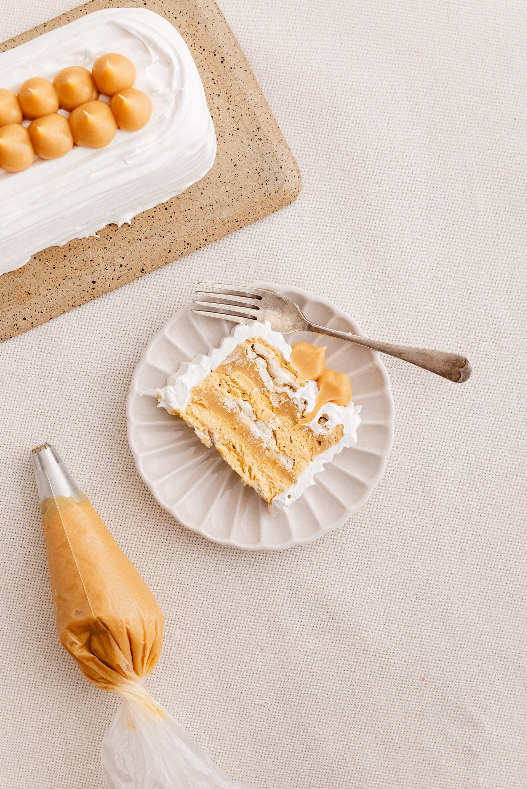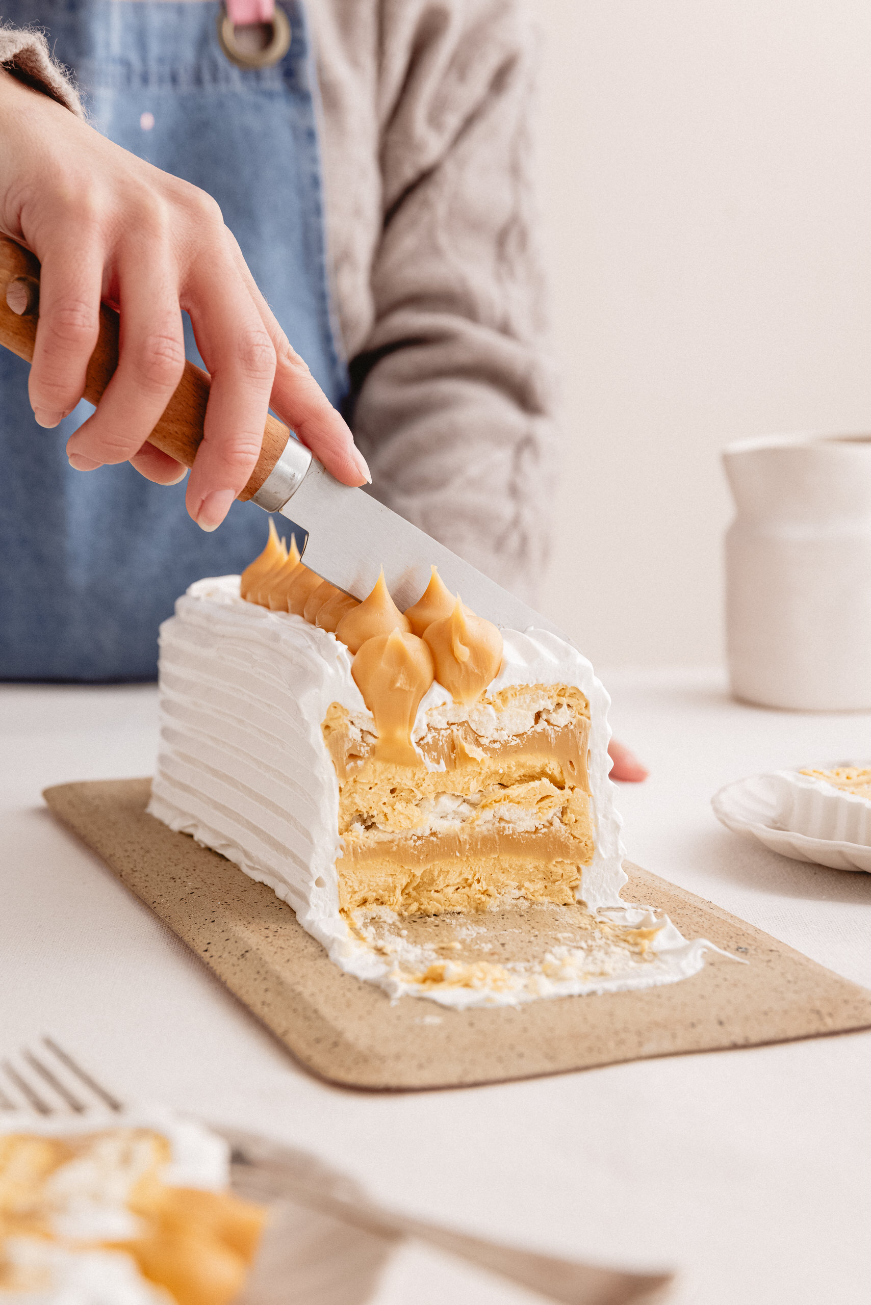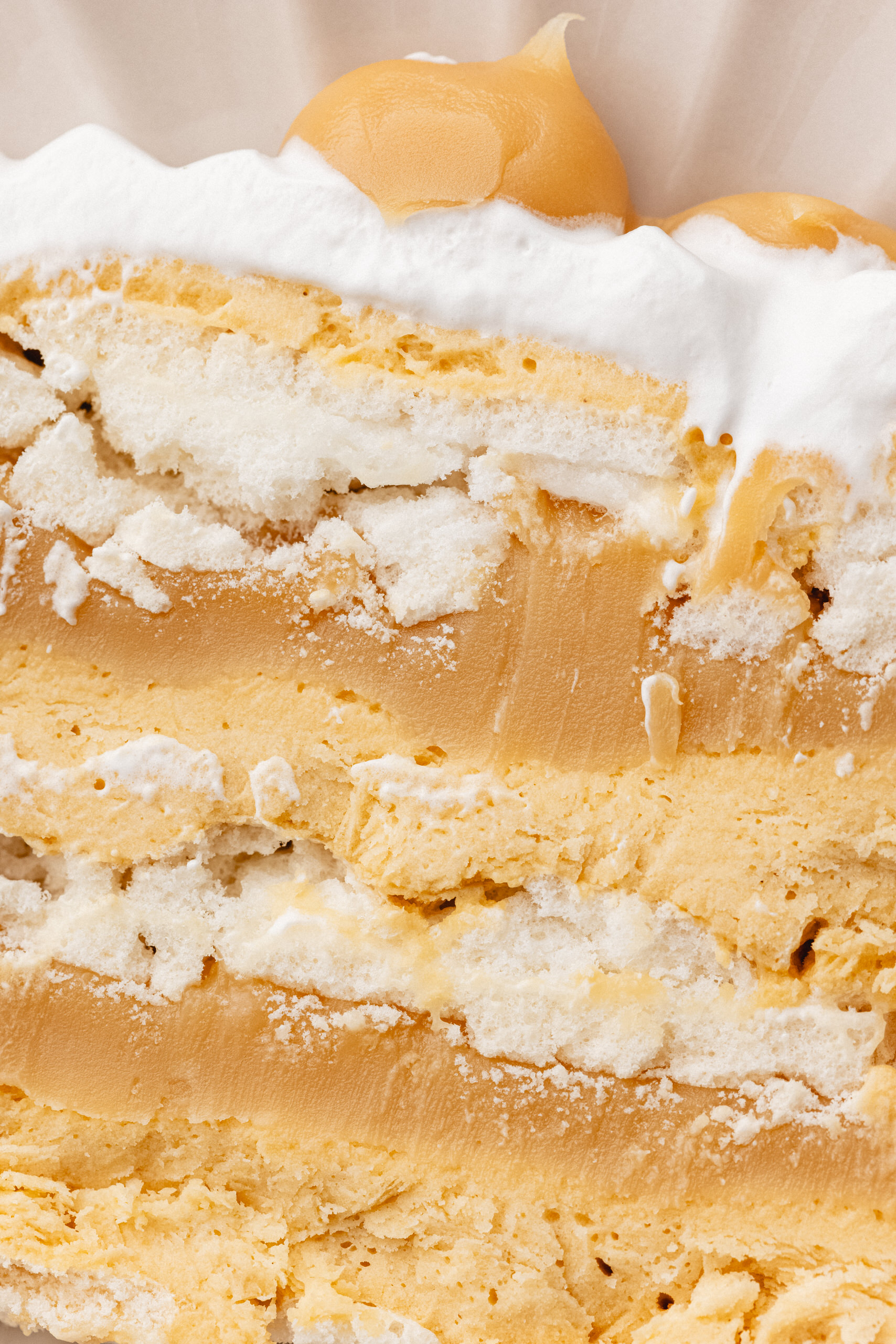 Merengue, Crema sin Lactosa, Pulpa de Lúcuma Natural y Manjar Artesanal. Decorada con Merengue y Lúcuma