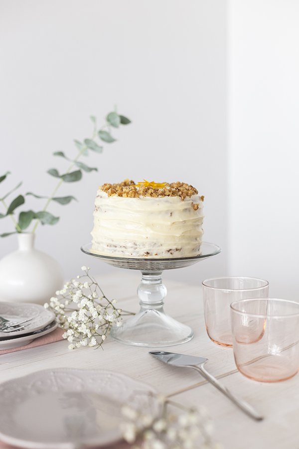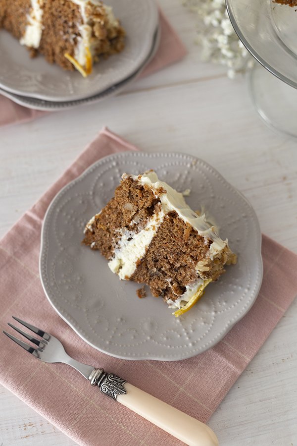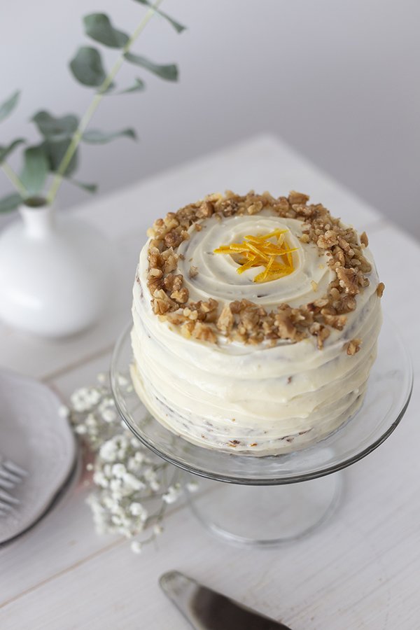 Bizcocho de zanahoria y especias, relleno de queso crema. Decorado con frosting de queso crema y nueces molidas.