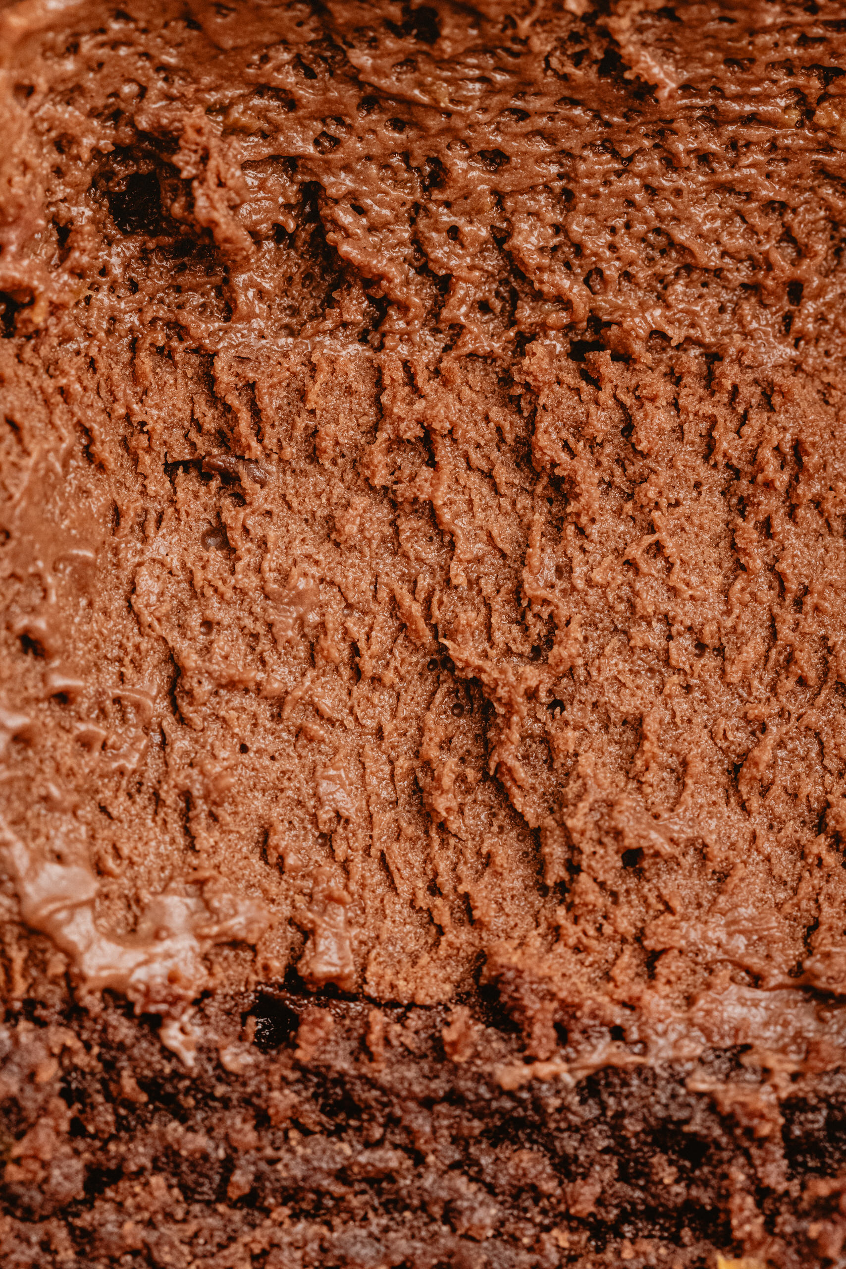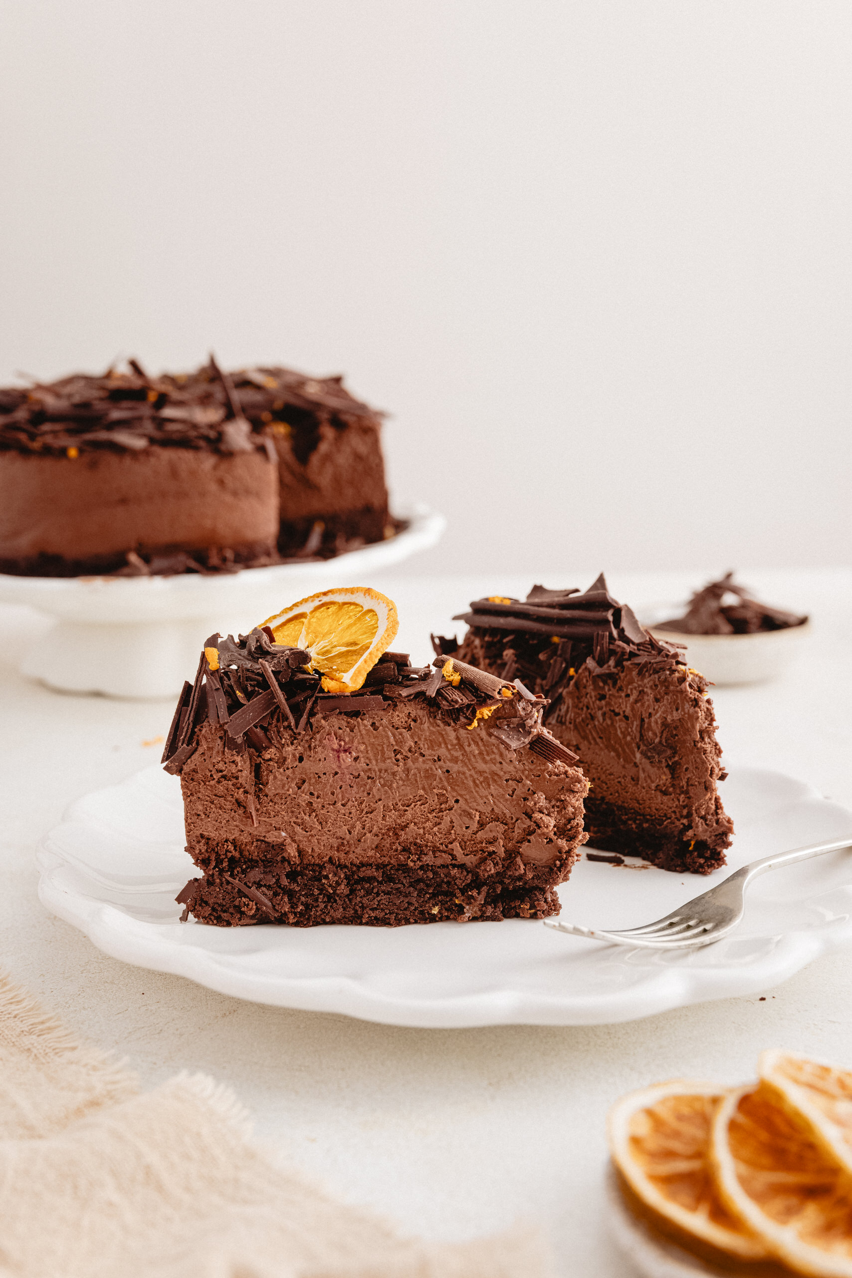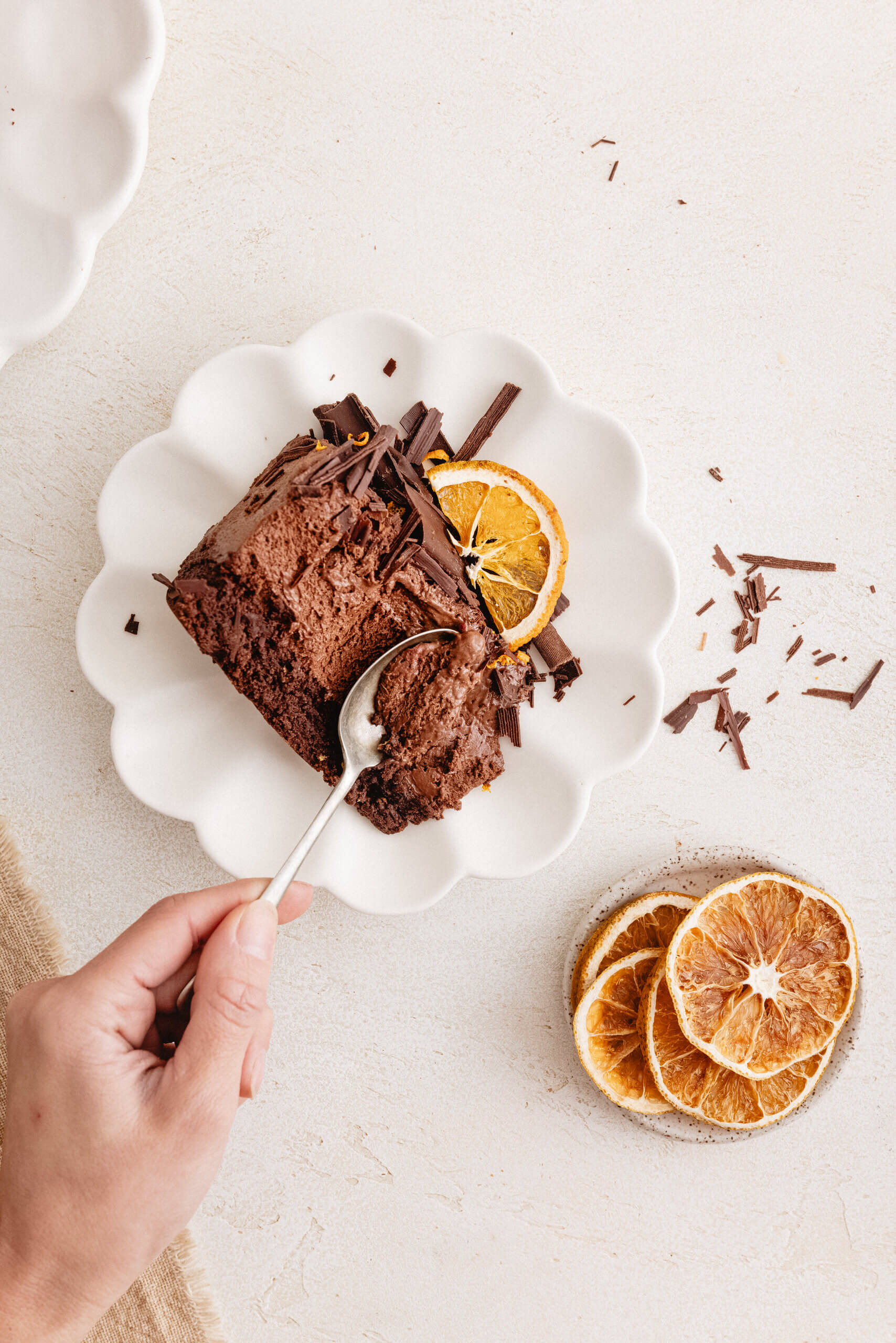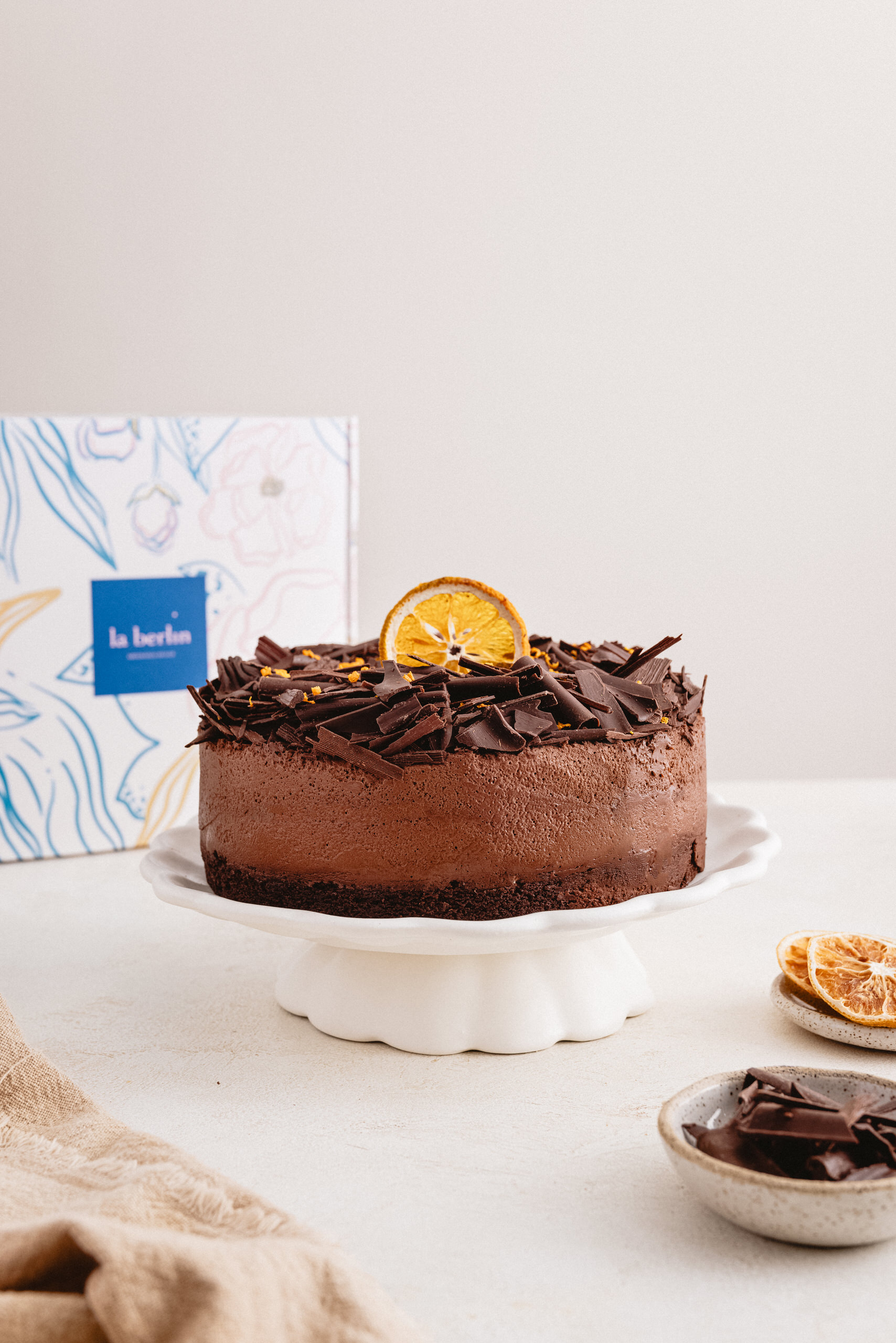 Base de brownie, mousse de chocolate semi amargo, naranja. Decorado chocolate en ramas.