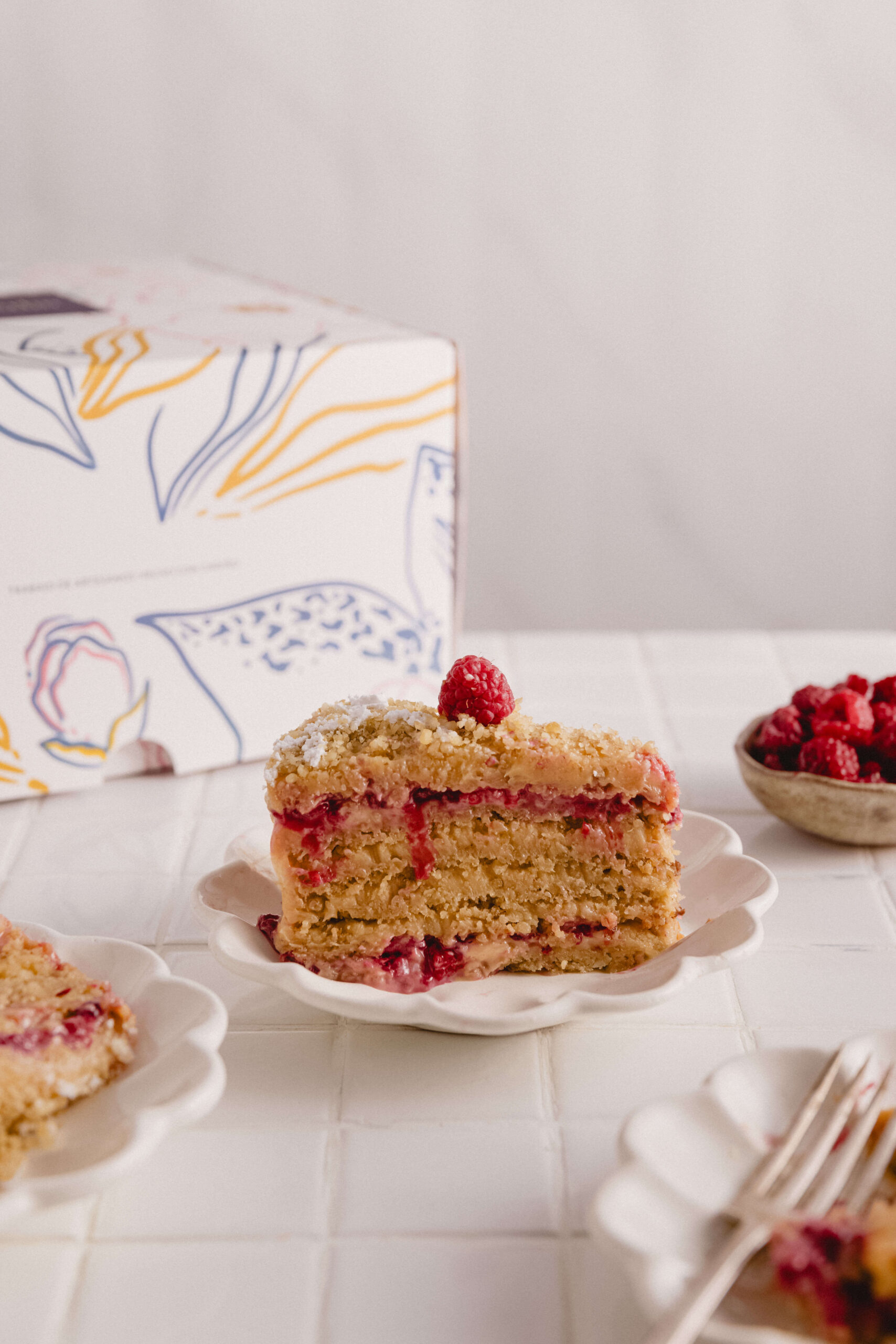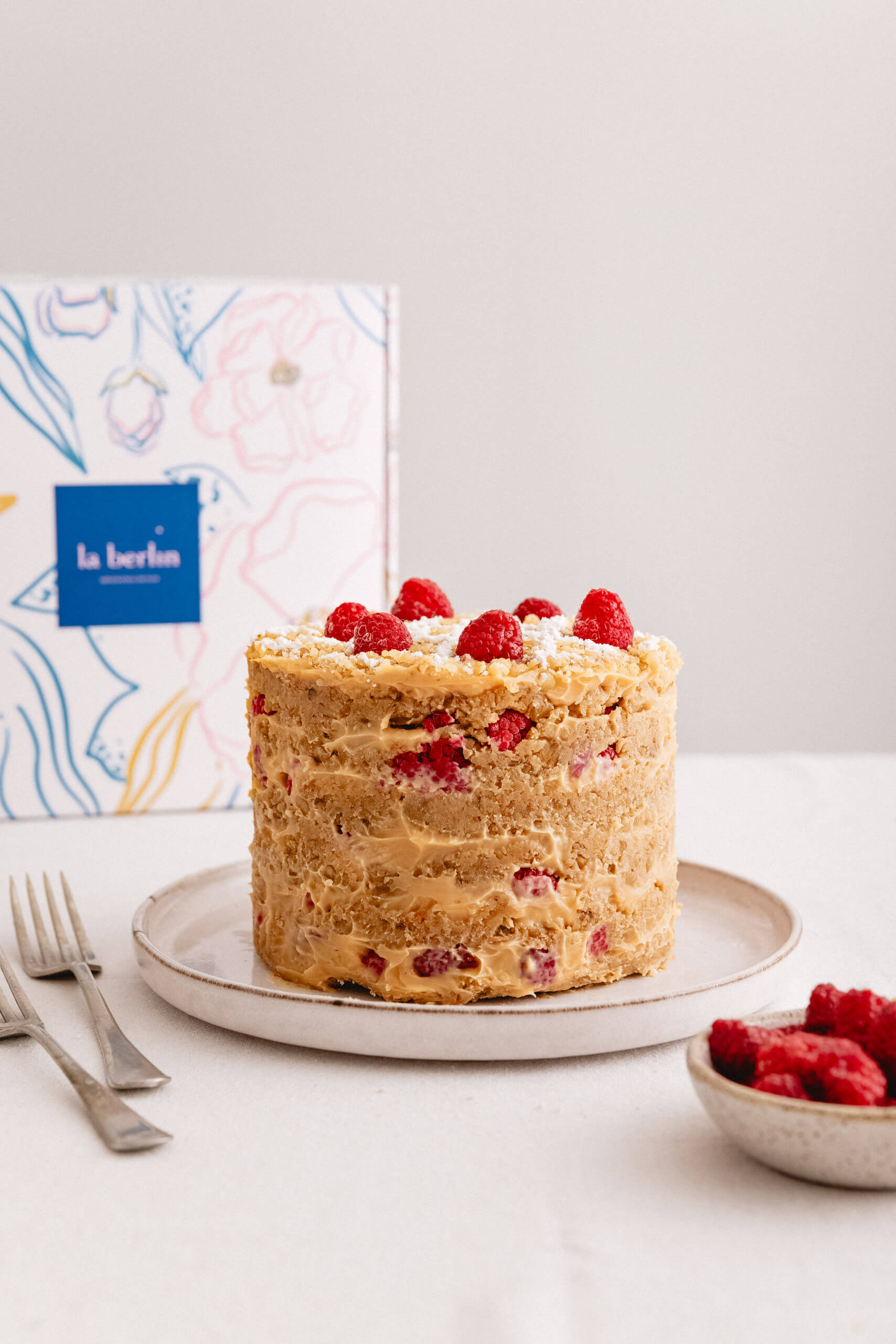 Discos de manjar y nueces relleno con manjar artesanal y frambuesas naturales. Decorada con azúcar flor y frambuesas.